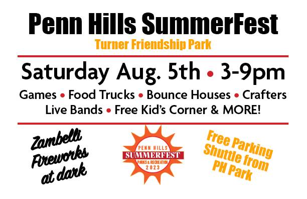 Penn Hills Summerfest is back again at Turner Friendship Park. The event is on August 5th 2023, between 3:00 PM and 9:00 PM. Please come for Local Crafters, Games, Live Bands, and Zambelli Fireworks!