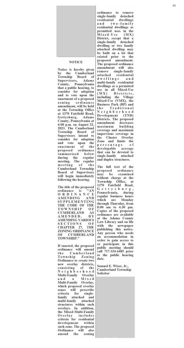 The Cumberland Township Board of Supervisors will hold a public hearing to consider for adoption and vote upon the enactment of a proposed zoning ordinance amendment. Please see attachment for more details. Vote to occur at the regular BOS meeting following the conclusion of the hearing.
