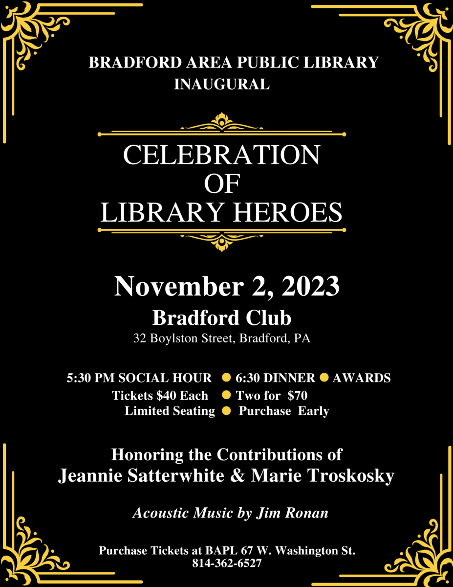 Join BAPL as we celebrate the generous contributions of two local ladies, Jeannie Satterwhite & Marie Troskosky. The inaugural Celebration of Library Heroes will be held on November 2 beginning at 5:30 PM with a social hour at the Bradford Club 32 Boylston St. Tickets are available at the Bradford Area Public Library. Individual and Corporate sponsorship opportunities are available (letters will be sent following the Labor Day holiday).