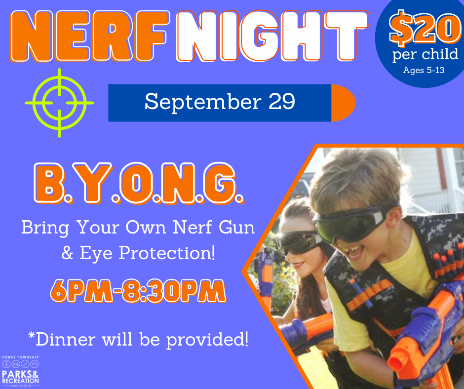Kids will work together to build their own forts and obstacles to defend from their opponents during battle. There will also be various skill checks throughout the night to see who is the best of the best. Dinner will be served as you can’t go into battle on an empty stomach. Please remember to bring your own nerf gun and eye protection (adequately labeled), we will provide all the ammunition!