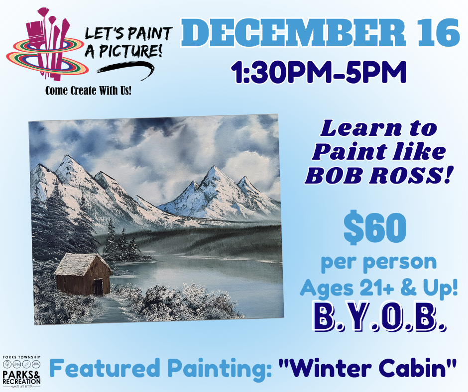 Learn to paint like Bob Ross, with Chris Severn a Certified Boss Ross Landscape Instructor. He created "Let's Paint a Picture" to help others learn the Bob Ross Method and share the Joy of Painting with them. He will guide you through each step of the process and encourages experimentation and playful approach. This class will help you develop your skills and confidence in creating art. This is a BYOB event.