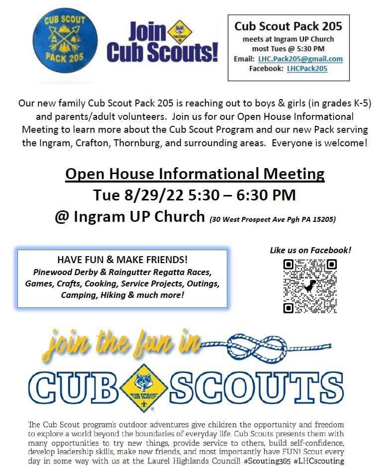 The new family Cub Scout Pack 205 is reaching out to boys & girls (in grades K-5) and parent/adult volunteers. Join us for an Open House Informational Meeting to learn more about the Cub Scout Program and our new Pack serving Ingram, Crafton, Thornburg , and surrounding areas.