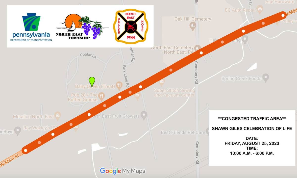 We are anticipating traffic congestion in the area of Gravel Pit Park, 10300 West Main Road. North East, PA 16428 on Friday, August 25, 2023 from approximately 11:00 a.m. to 6:00 p.m.