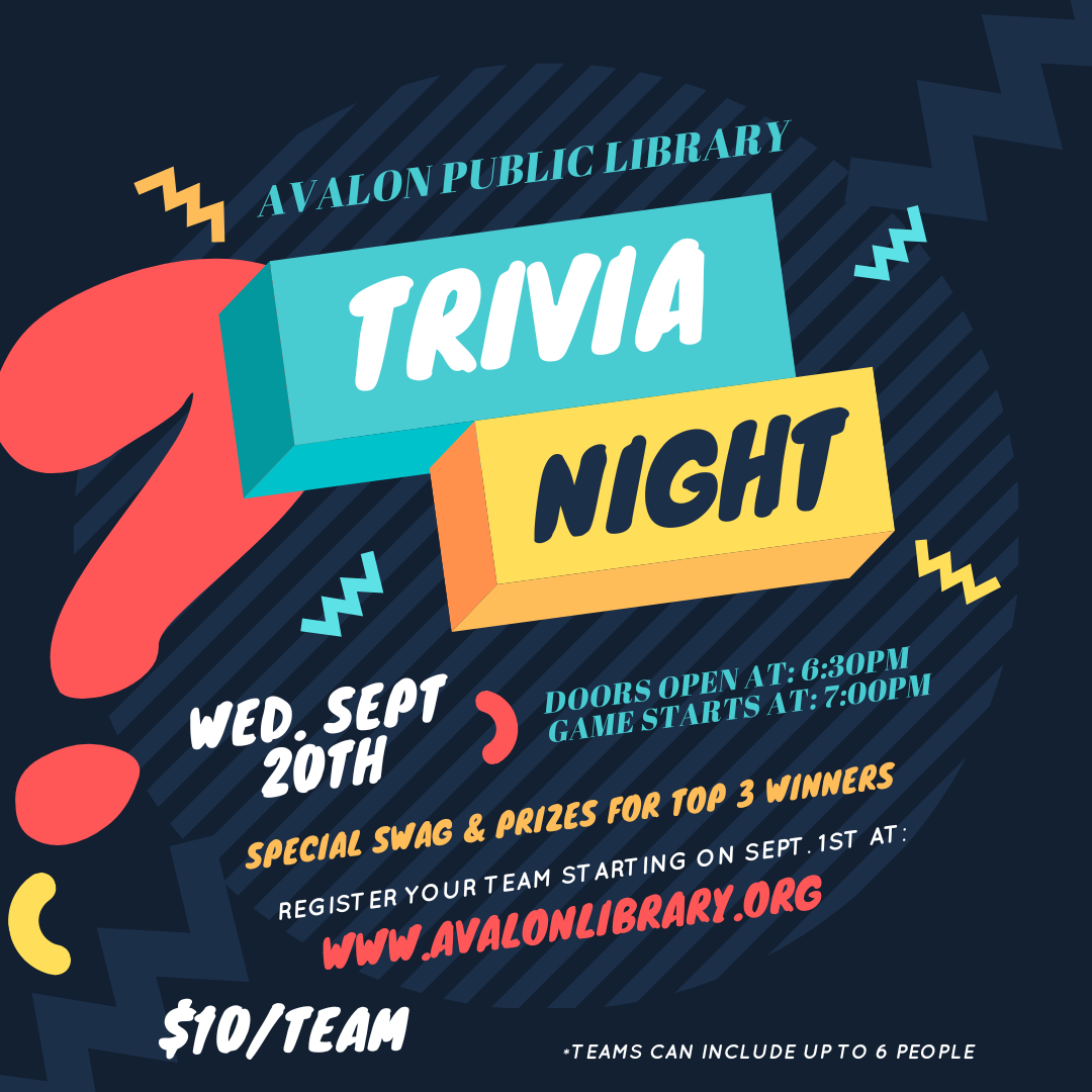 Gather a team of up to 6 people for a fun trivia night at the library for your chance to win a prize! The cost is $10 per team and teams can begin registering on our website on September 1st!