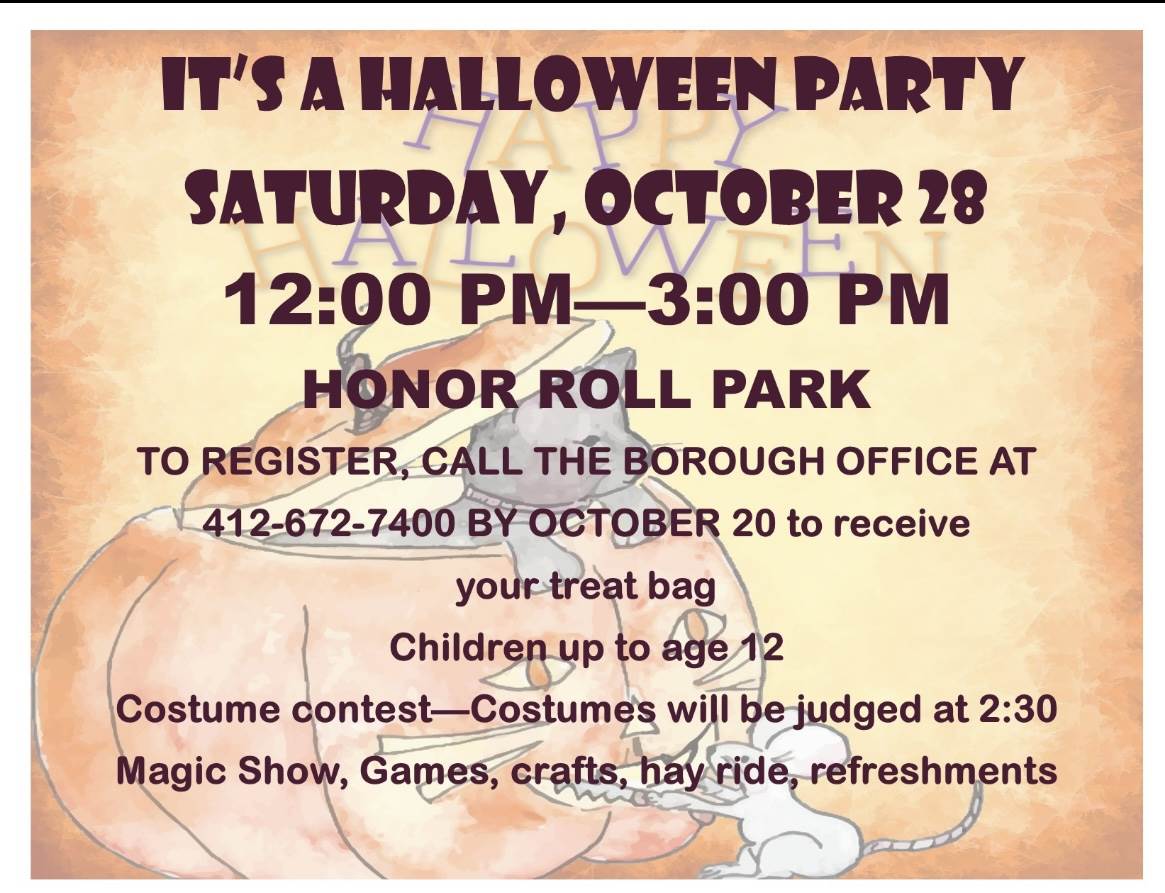 To register, call the Borough Office at 412-672-7400 by October 20th to receive a treat bag.