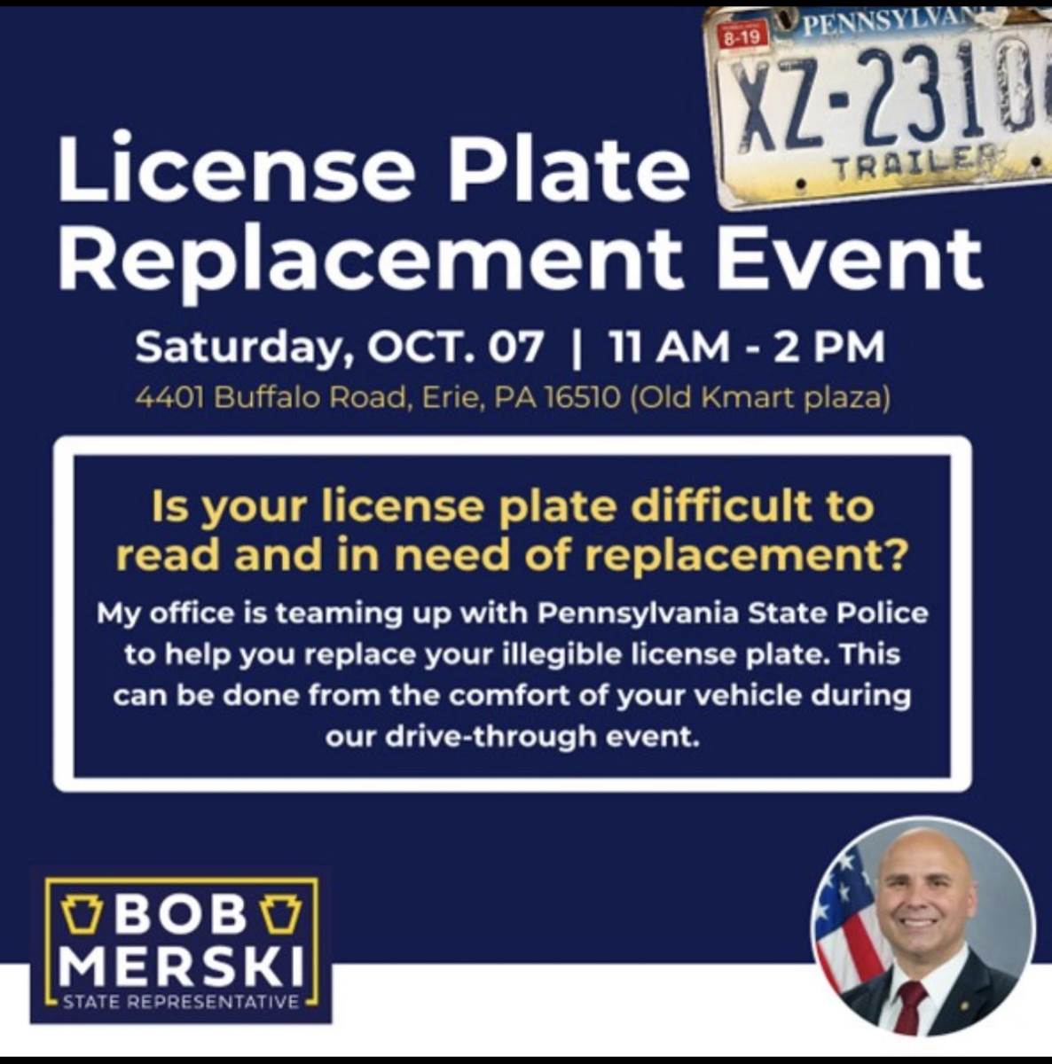 State Rep. Bob Merski is hosting a drive-through event this Saturday, October 7 to help motorists learn whether they need a new license plate and to help them apply for a free replacement if it is determined to be illegible.