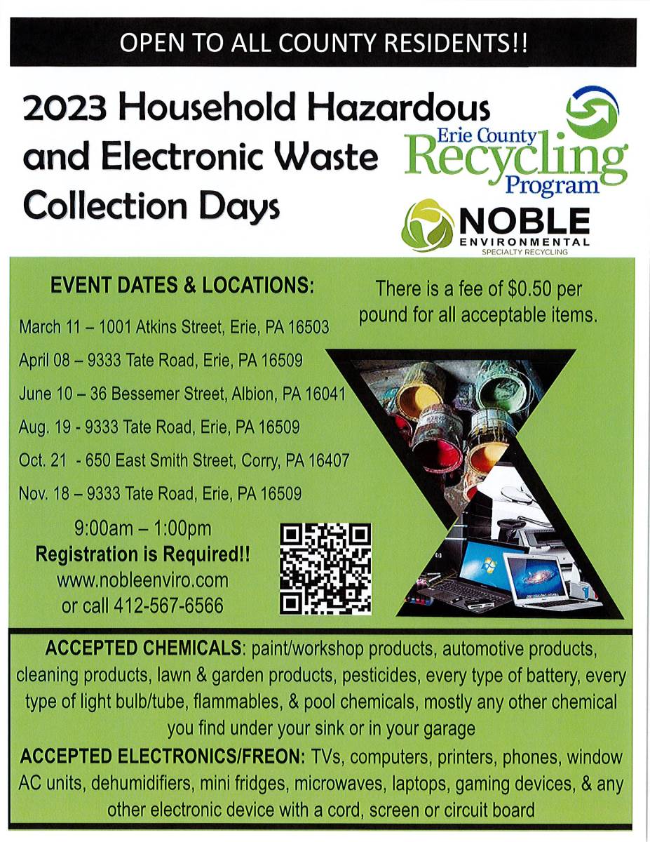 Greene Township will host the Erie County Recycling Progam. Registration is required. There is a fee of .50 per pound of material. See attached flyer for more information and acceptable chemicals and electronics.