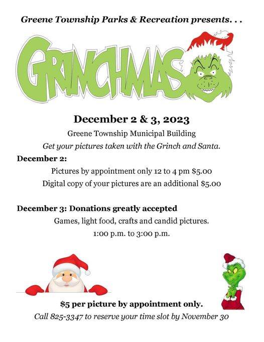 Greene Township Parks and Rec presents: Grinchmas! Get your pictures taken with the Grinch and Santa on December 2nd, an appointment is required. Return for "Whobilatin Games" on the 3rd. Please call the township office at 825-3347 to schedule. See the attached flyer for complete details