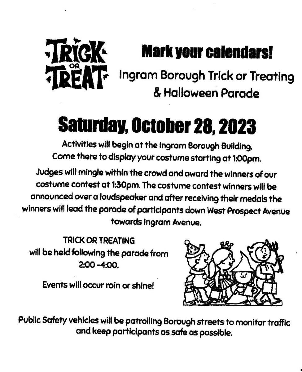 The annual tradition of Trick or Treat will be observed in Ingram Borough on Saturday, October 28, 2023, between 2:00 pm and 4:00 pm with a Costume Contest at 1:00 pm at the Borough Building followed by a parade at 1:30 pm. (flyer attached)