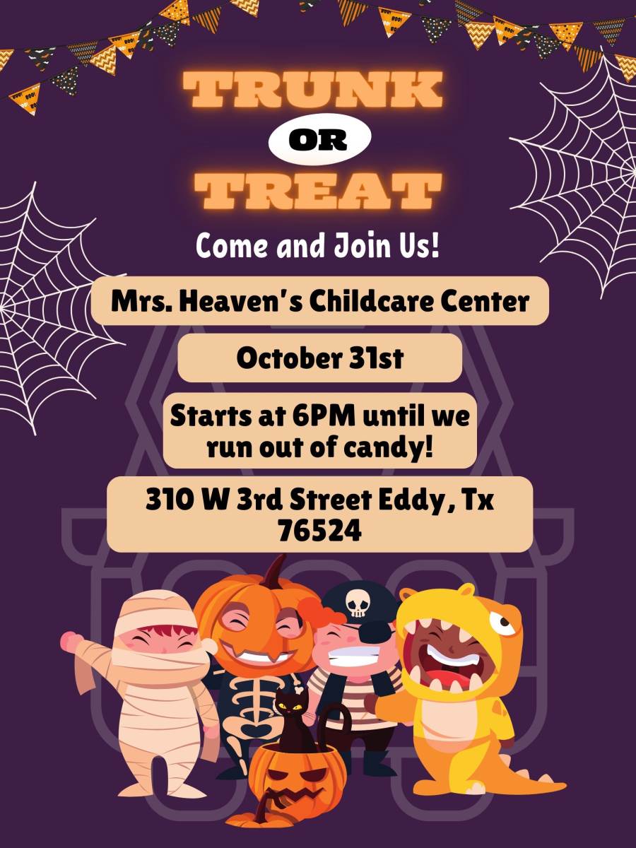 Mrs. Heaven's Childcare Center will host a trunk or treat event.