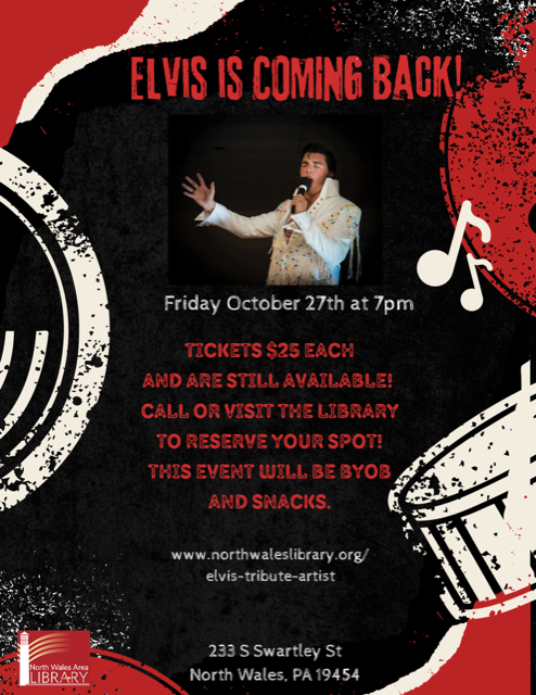 Elvis tribute artist Jeff Krick Jr. will be back at the Library this October by popular demand! This event will be BYOB and snacks. Tickets are $25 are available for purchase now! Call or visit the Library to reserve your spot.