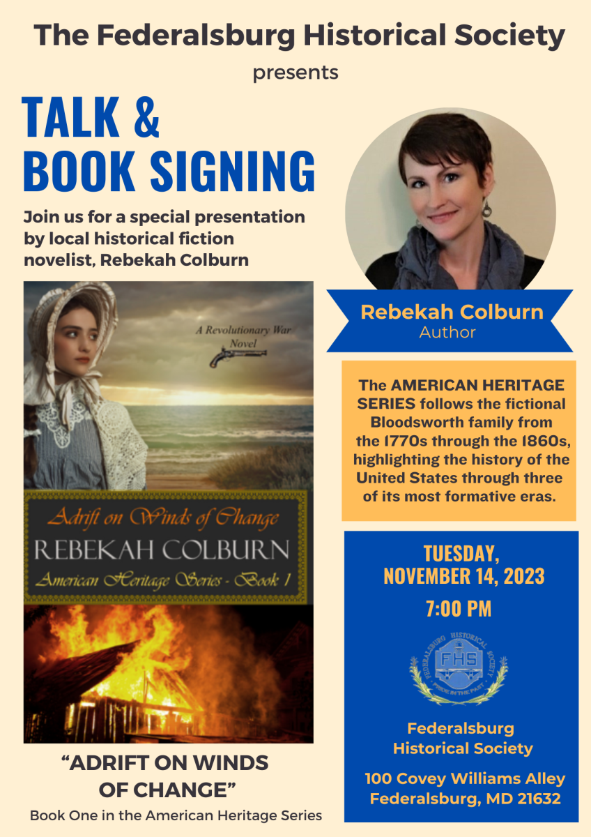 The public is invited to the November meeting of the Federalsburg Historical Society. Featured guest will be local author, historical fiction novelist, Rebekah Colburn.