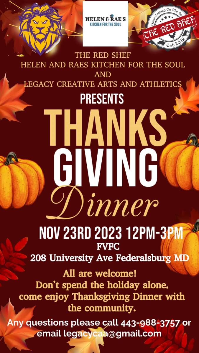 Legacy Creative Arts and Athletics is hosting their second annual Thanksgiving Dinner at the FVFC. This year it will be catered by The Red Shef and Helen and Rae’s Kitchen for the Soul. All are welcome. Don't spend Thanksgiving alone. Donations are being accepted. Contact legacycaa@gmail.com or 443-988-3757 with questions.