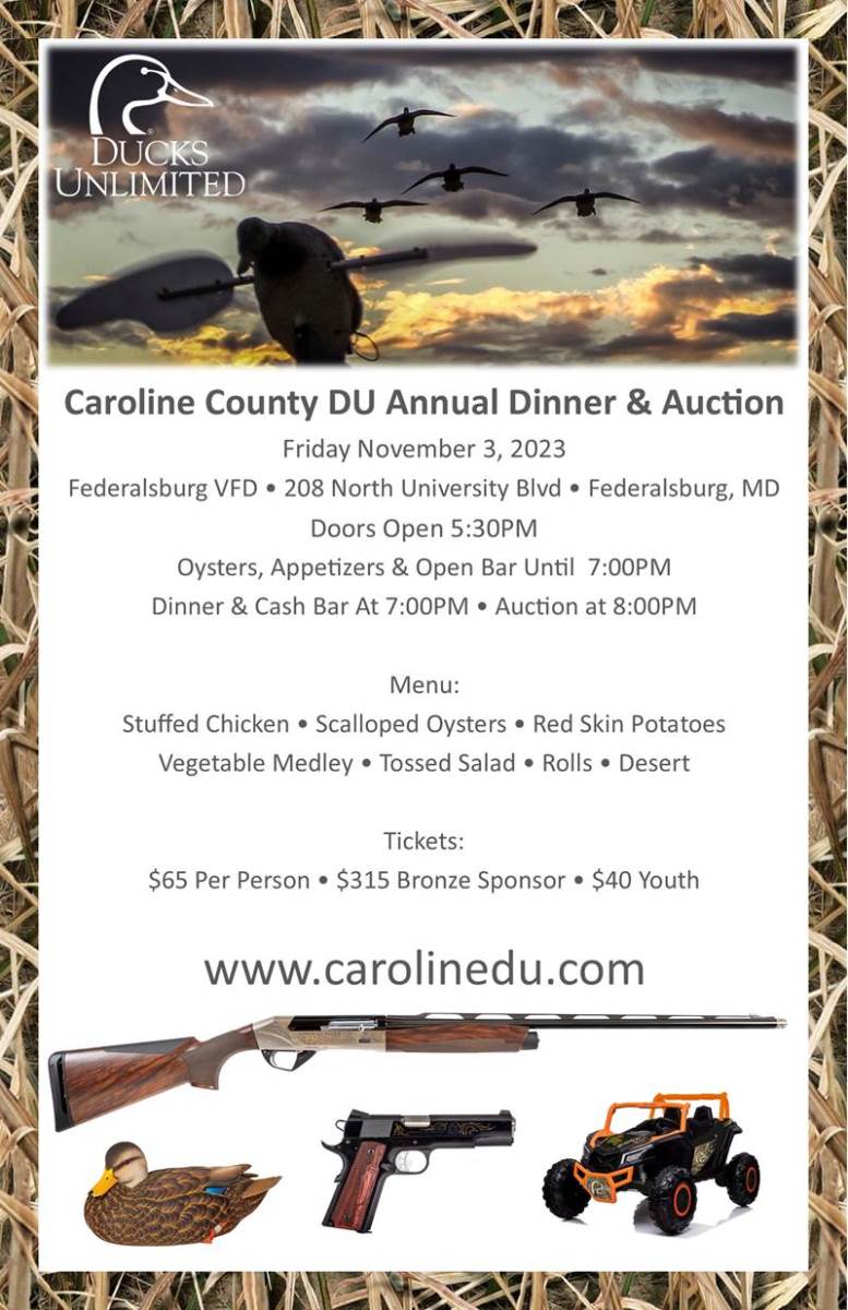 The annual Caroline County Ducks Unlimited Dinner & Auction will be held at the FVFC. Doors open at 5:30. Oysters, appetizers & open bar until 7:00. Dinner & cash bar at 7:00. Auction at 8:00. See attached flyer for menu. Contact carolinedu.com for tickets.