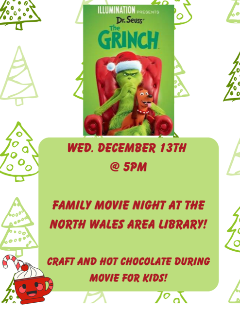 Join us for a family move at North Wales Library! We'll be screening Dr. Seuss' The Grinch on Wednesday, December 13th at 5pm. There will be a craft and hot chocolate for kids during the movie!