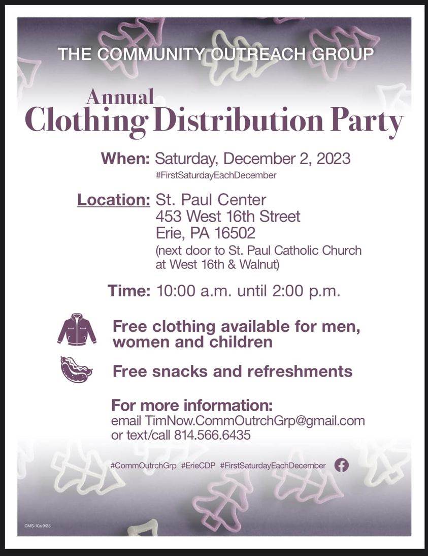 Come to the Annual Clothing Distribution Party at the St. Paul Center on Saturday, December 2nd, to receive clothing for men, women, and children COMPLETELY FREE. Between 10am – 2pm.