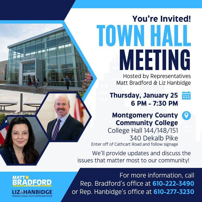 Thursday, January 25th, 6-7:30 - Representatives Matt Braford and Liz Hanbidge are hosting a Town Hall Meeting at Montgomery County Community College.
