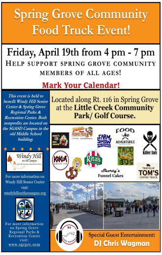 Spring Grove Regional Parks & Recreation Center and Windy Hill Senior Center will be holding a food truck event on Friday, April 19th from 4pm-7pm at Little Creek Community Park/Golf Course.