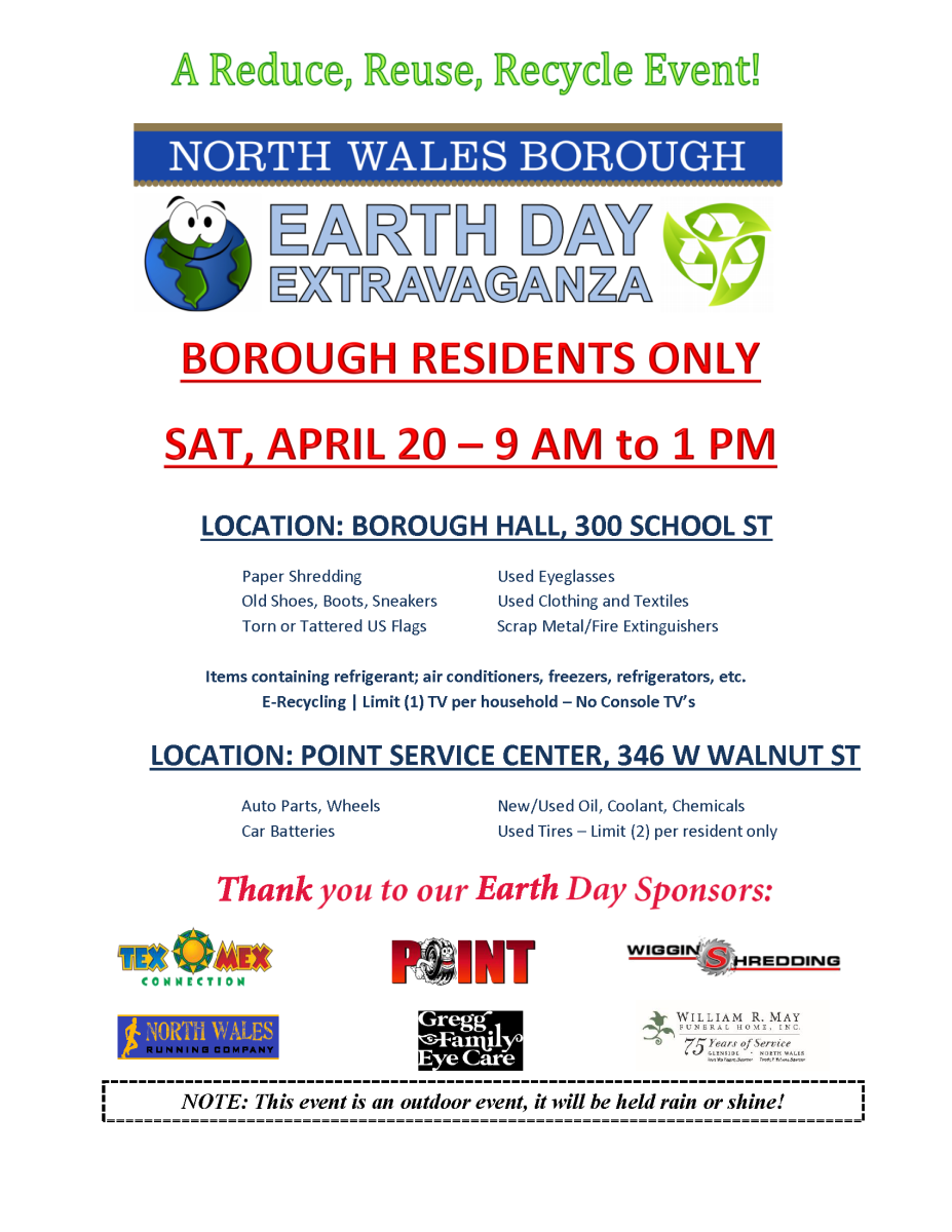 Open to North Wales Borough Residents. See attached flyer for a list of everything that can be shredded, donated, or recycled at this event!