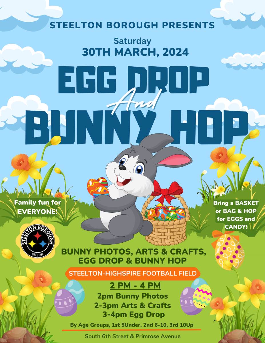 Exciting Alert! Steelton Borough's Egg Drop & Bunny Hop is set for March 30th, 2-4 PM at Steelton-Highspire Football Field?? Promptly starting at 2pm with Arts and Crafts, Bunny photos by Emory's Memories , music provided by DJ Tommy T, giveaways and much more. ?????? Don't forget to bring your baskets! ( bags will be available if you forget ) First round of Egg Drops start at 3 PM: for ages 5 & under, then 6-10, and finally 10+. Join the Borough of Steelton and egg-speriance a basket full of fun and hopping moments that will crack you up.