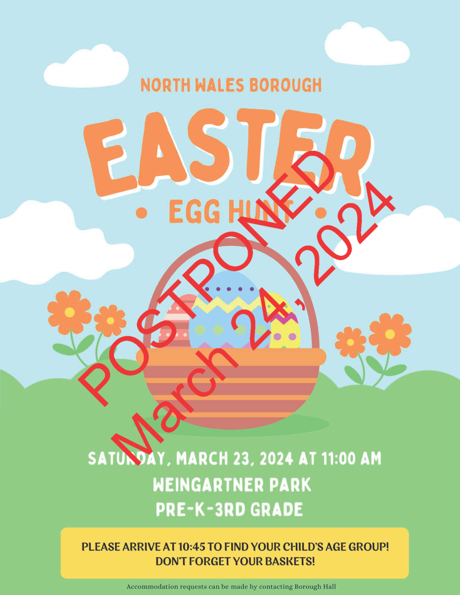 Due to forecasted rain, the North Wales Borough Egg Hunt will now take place on Sunday, March 24th, 2024 at 11:00AM. Bring your baskets and your boots!