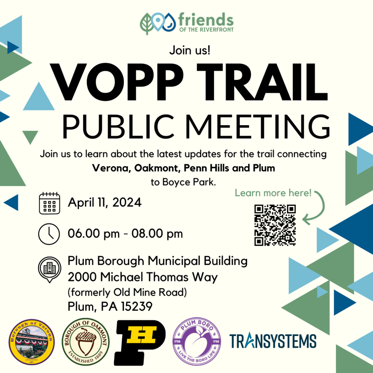 Please join us on April 11th, 2024 at the Plum Borough Municipal Building for the latest updates regarding the VOPP Trail.