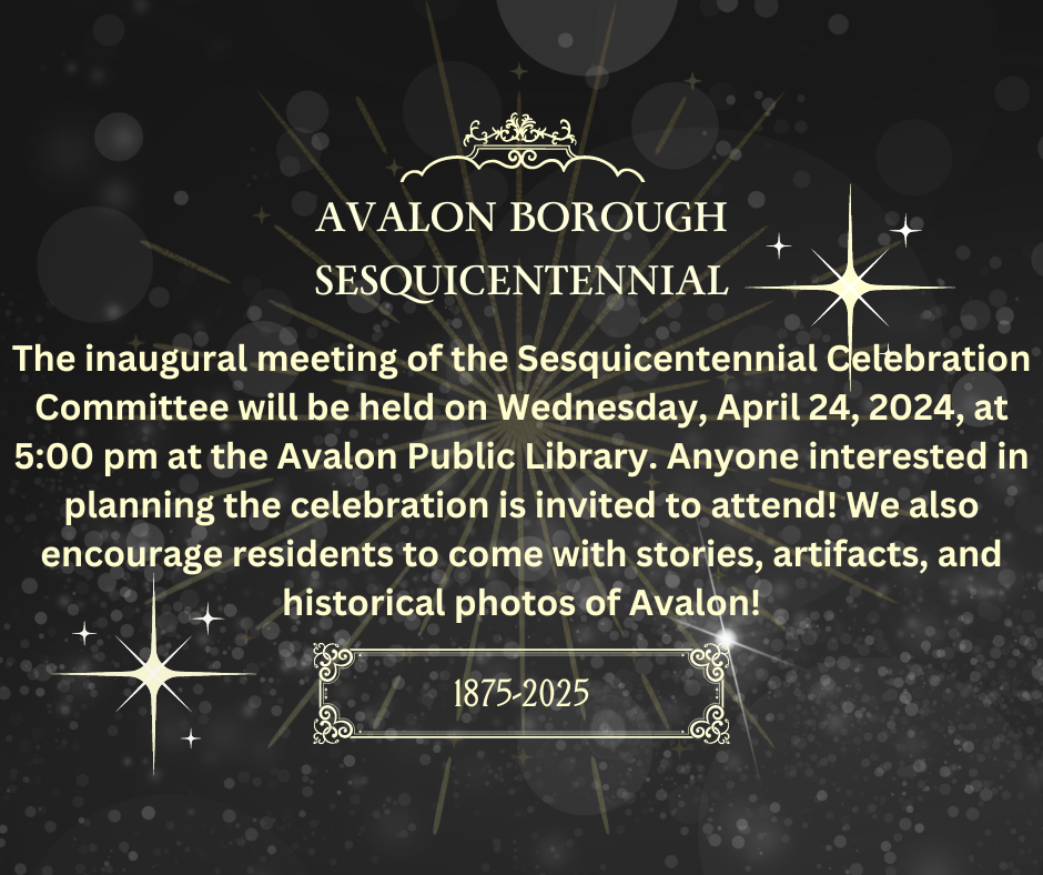 The inaugural meeting of the Avalon Borough Sesquicentennial Celebration Commitee! All are welcome to attend. Please bring any historical photos, mementos, and stories to share.