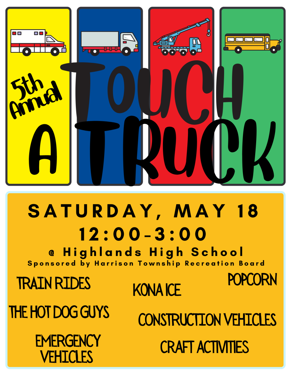 The Harrison Township Recreation Board proudly presents its 5th Annual Touch-a-Truck event on Saturday, May 18th, 2024, from 12:00 pm -3:00 pm at Highlands High School. Come join us for train rides, emergency vehicles, construction vehicles, crafts, and snacks!