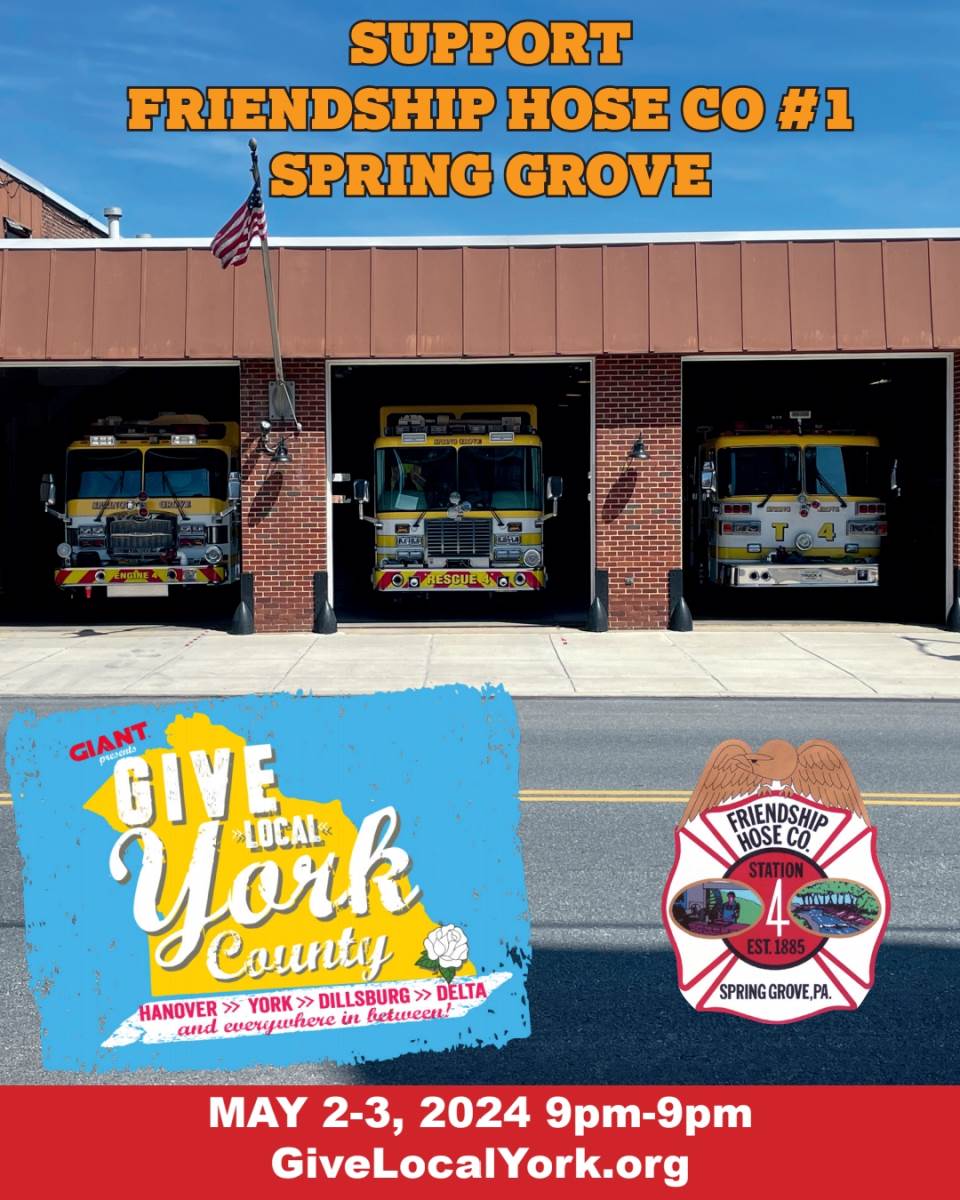 We ask of our local community and county to assist in supporting our organization by donating funds. The complete month of April all donations are able to be dropped off at the fire department or mailed to Friendship Hose Company #1 73 S. Main Street PO Box 64, Spring Grove Pa 17362. The Big day May 2nd at 9pm through May 3rd at 9pm you may log on to Give Local York Big Give Day 2024.