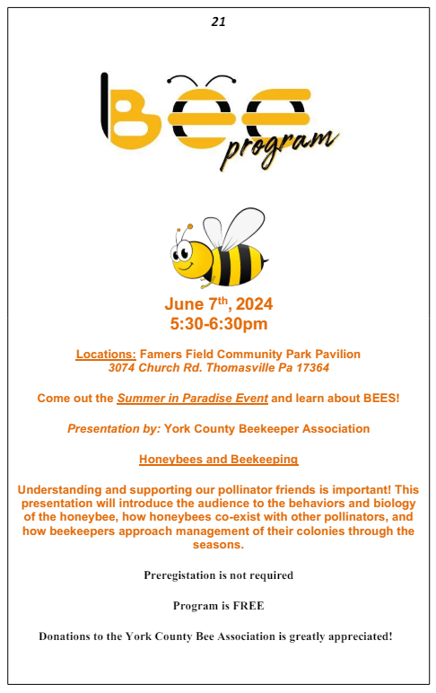 York County Beekeeper Association is presenting a bee education program during the Summer in Paradise Event.