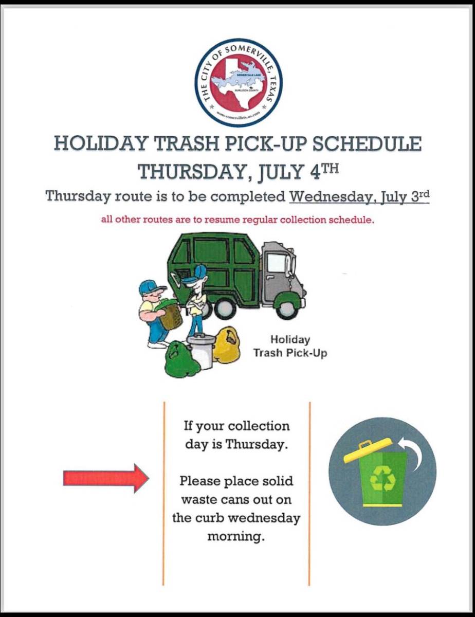 If your collection day is Thursday, please place your garbage cans out on the curb Wednesday morning. If you have any questions, please call city hall (979) 596-1122.