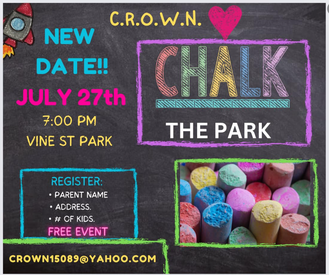 July 27th - This is a FREE EVENT open to families in West Newton and surrounding communities!! Giant freeze pops for each child registered!! Bring the kids… and have your friends bring their kids…CROWN will provide the chalk!!