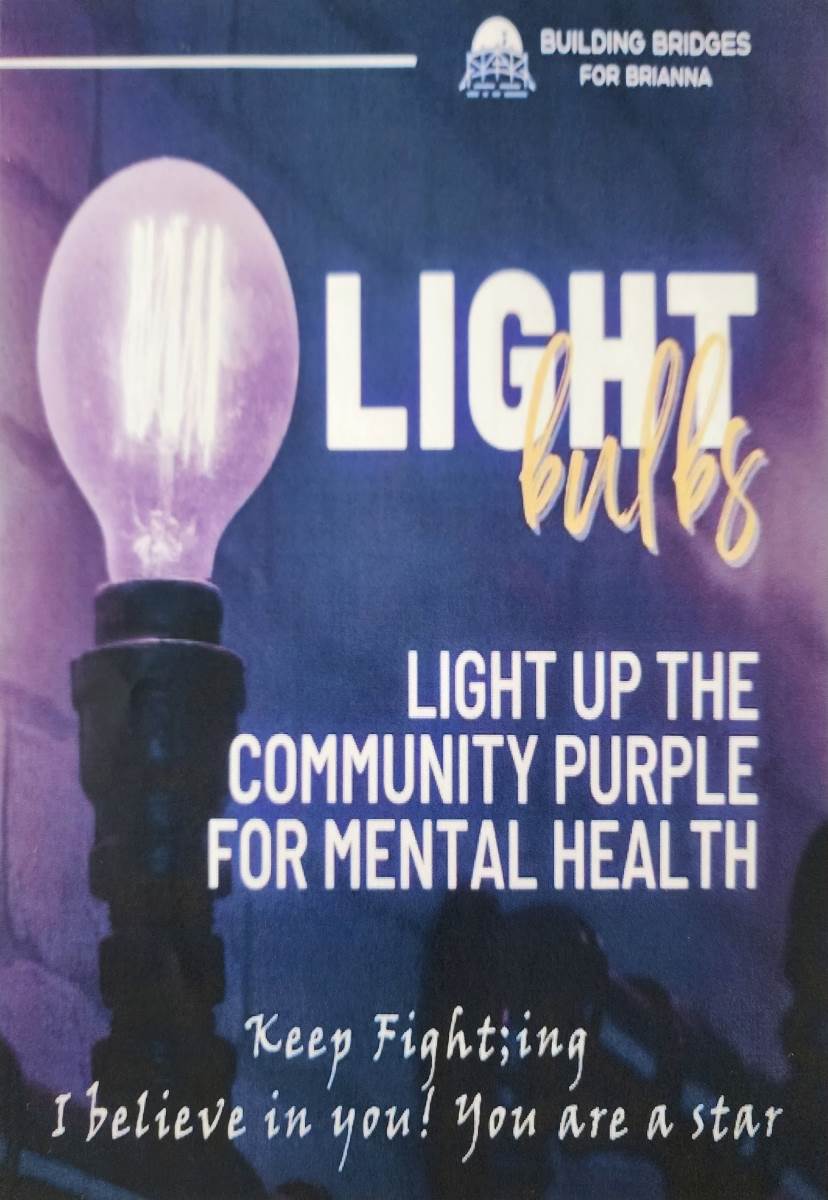 If you are willing, 'Building Bridges for Brianna' asks that you replace 1 or more outside light bulbs to a PURPLE BULB to show the community that you are behind them in their fight against mental health. This will be for the entire month of September.