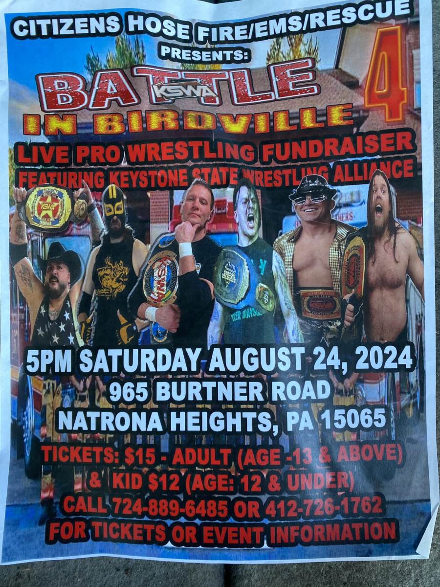 Join Citizens Hose on August 24, 2024 for a fun-filled day of music, cool cars, vendors, food, and the chance to dunk your favorite KSWA Wrestler. Event starts at 12:00 pm until 5:00 pm. The KSWA Wrestling event will start at 5:00 pm and tickets are available at the station located at 965 Burtner Road, Natrona Heights, or through any member.