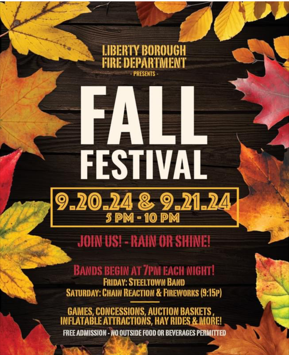 Liberty Borough Volunteer Fire Department is hosting their Fall Festival on 9/20/24 & 9/21/24 5pm - 10pm Please come out and support the Fire Department.