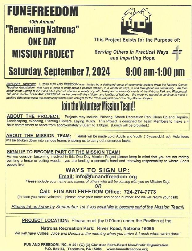 Join Fun and Freedom along with Natrona Comes Together Association on September 7, 2024 at 9:00 am at the Pavilion for a day of park repairs and fall cleanup. Adults and youth (10 years old and up) are welcome to join. Register by email infor@funandfreedom.org or call 724-274-7773 to register. A light breakfast and lunch will be provided for volunteers.