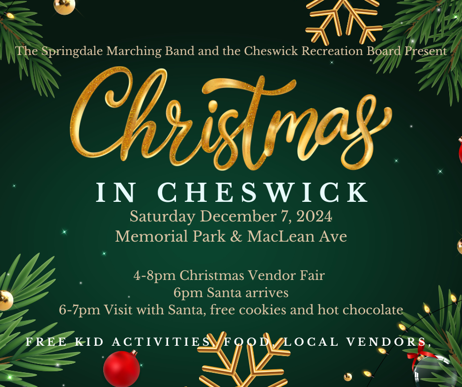 The Cheswick Recreation Board and the Springdale Marching Band Booster are collaborating to bring you Christmas in Cheswick!