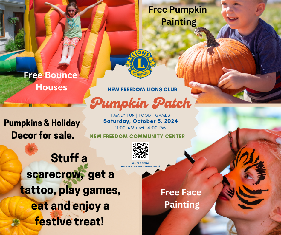 New Freedom Lions Club will host a "Pumpkin Patch" event on Saturday October 5, 2024 from 11:00AM-4:00PM at the New Freedom Community Center.