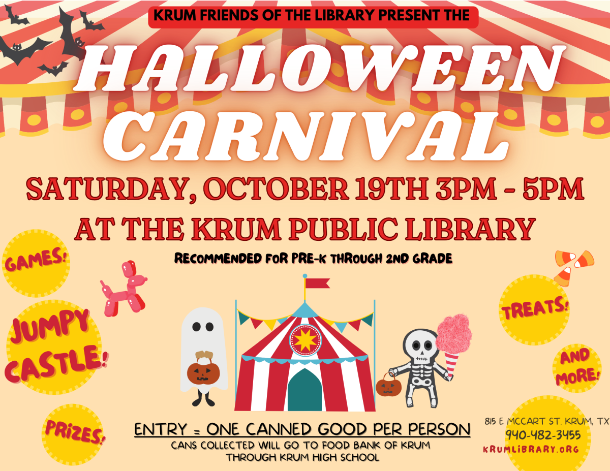 Games, prizes, bounce house, and more! Canned goods required for entry. Presented by Krum Friends of Library.