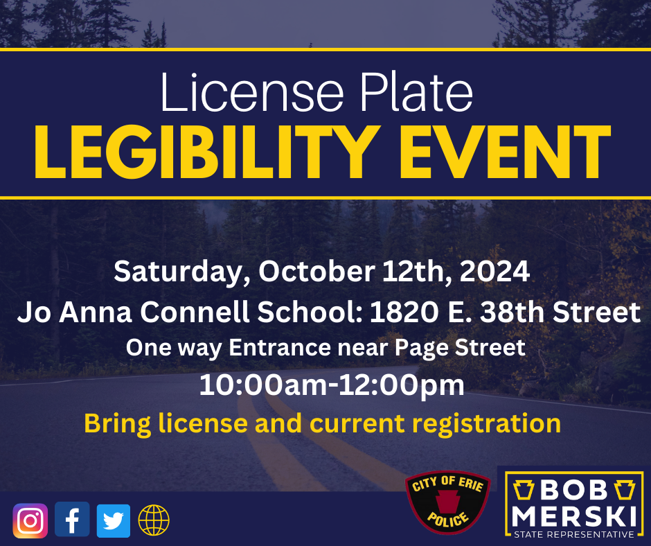 State Rep. Bob Merski will host a license plate legibility/replacement event Saturday, October 12 to help motorists learn whether they need a new license plate and to help them apply for a free replacement if their plate is determined to be illegible. With the partnership of Erie Police Department this event will take place from 10 a.m. to 12 p.m. at the Jo Anna Connell School, located at 1820 E. 38th St. Participant must bring license and current Registration. Call 814-455-6319 with questions.