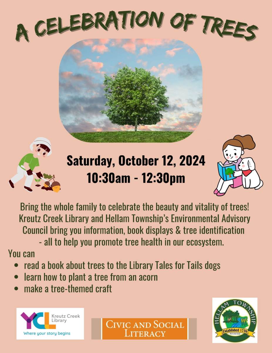 Kreutz Creek Library and Hellam Township’s Environmental Advisory Council bring you information, book displays & tree identification- all to help you promote tree health in our ecosystem. You can read a book about trees to the "Library Tales for Tails" dogs, learn how to plant a tree from an acorn, and make a tree-themed craft. All for FREE!