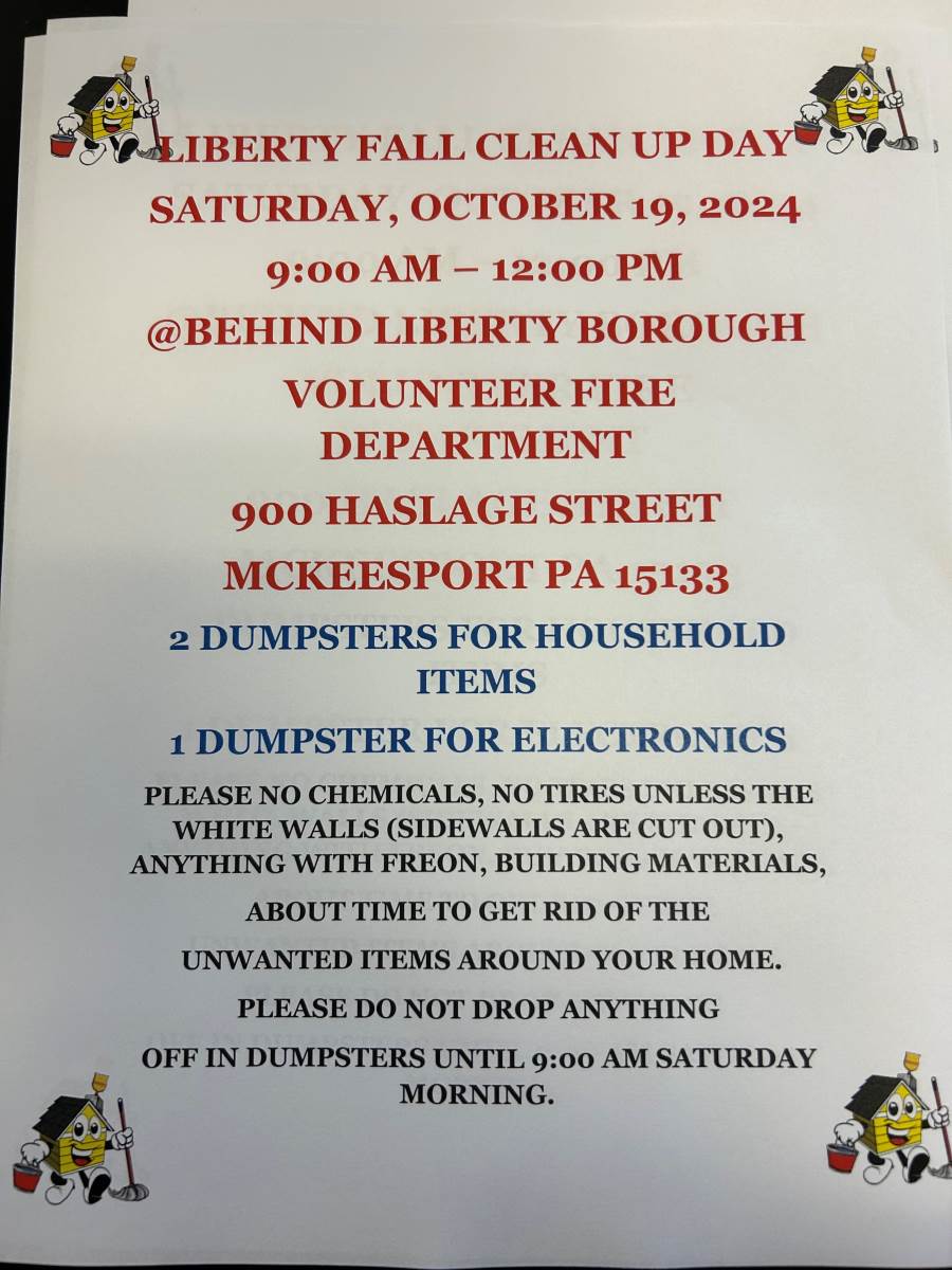 LIBERTY BOROUGH FALL CLEAN UP IS SATURDAY, OCTOBER 19TH 9AM - 12PM BEHIND LIBERTY BOROUGH VOLUNTEER FIRE DEPARTMENT 900 HASLAGE STREET