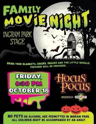 Please join Ingram Borough on Friday October 18, 2024 in Foster Park at 6:30 p.m. for Hocus Pocus!!