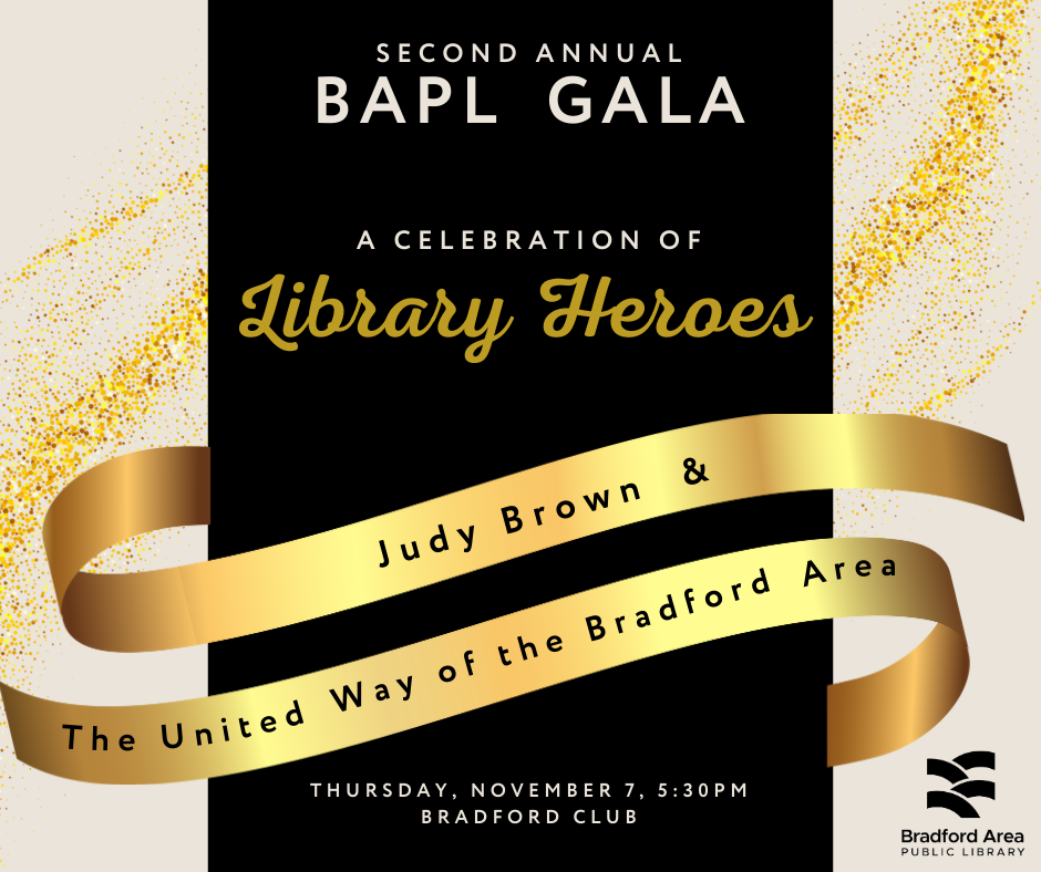 To celebrate all that we do, we will be honoring one person and one non-profit organization at our second annual Celebration of Library Heroes event on Thursday, November 7. Judy Brown, and The United Way of the Bradford Area are this year’s honorees. Join us as we recognize their meaningful contributions to our community library. Tickets are $50 and include a buffet-style dinner at the Bradford Club. Doors open at 5:30 PM for a social hour, followed by dinner and the awards ceremony rounding out the evening. Get your tickets early as seating will be limited. Purchase your ticket(s) easily online when you visit this link: https://bradfordlibrary.org/news-events/event-calendar.html/event/2024/11/07/bapl-gala-a-celebration-of-library-heroes/498852