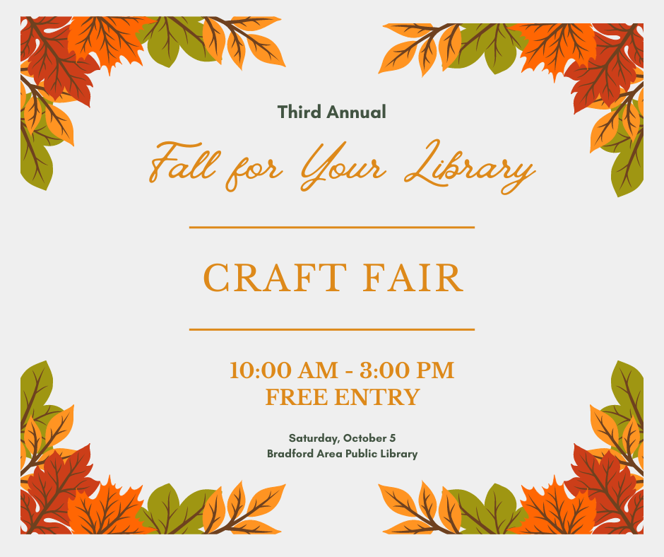 The "Fall for Your Library" craft fair is returning to BAPL on Saturday, October 5 (10AM - 3PM). This is a wonderful opportunity to find unique gifts for the upcoming holiday season, or something special for yourself. We hope to grow this event with your support! A variety of vendors will be present, with each offering a different product line.