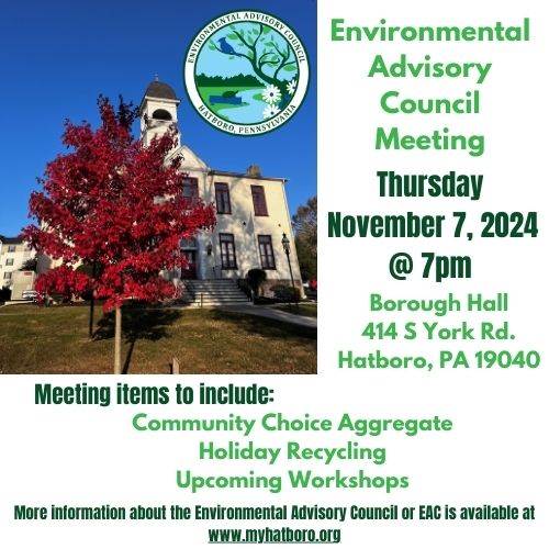 More information about the Environmental Advisory Council is available at www.myhatboro.org, or on Facebook at https://www.facebook.com/profile.php?id=61558163812797