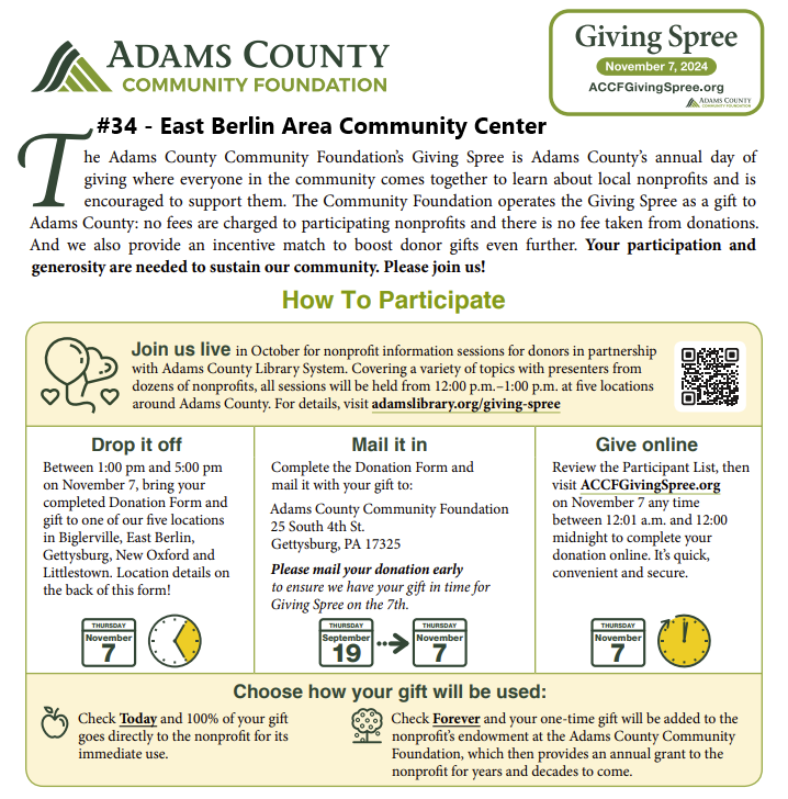 - Mail: Send your donation form and gift to the Adams County Community Foundation, 25 South 4th St., Gettysburg, PA 17325.