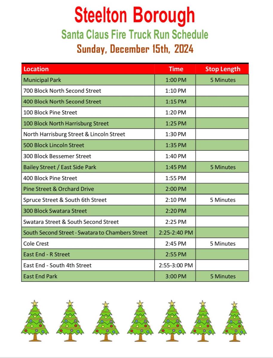 The 2024 Steelton Santa Truck Run will take place on Sunday, December 15 from 1:00 PM to 3:00 PM. Santa, Mrs. Claus, and the elves will be riding around Steelton in the fire truck greeting families! ???????????