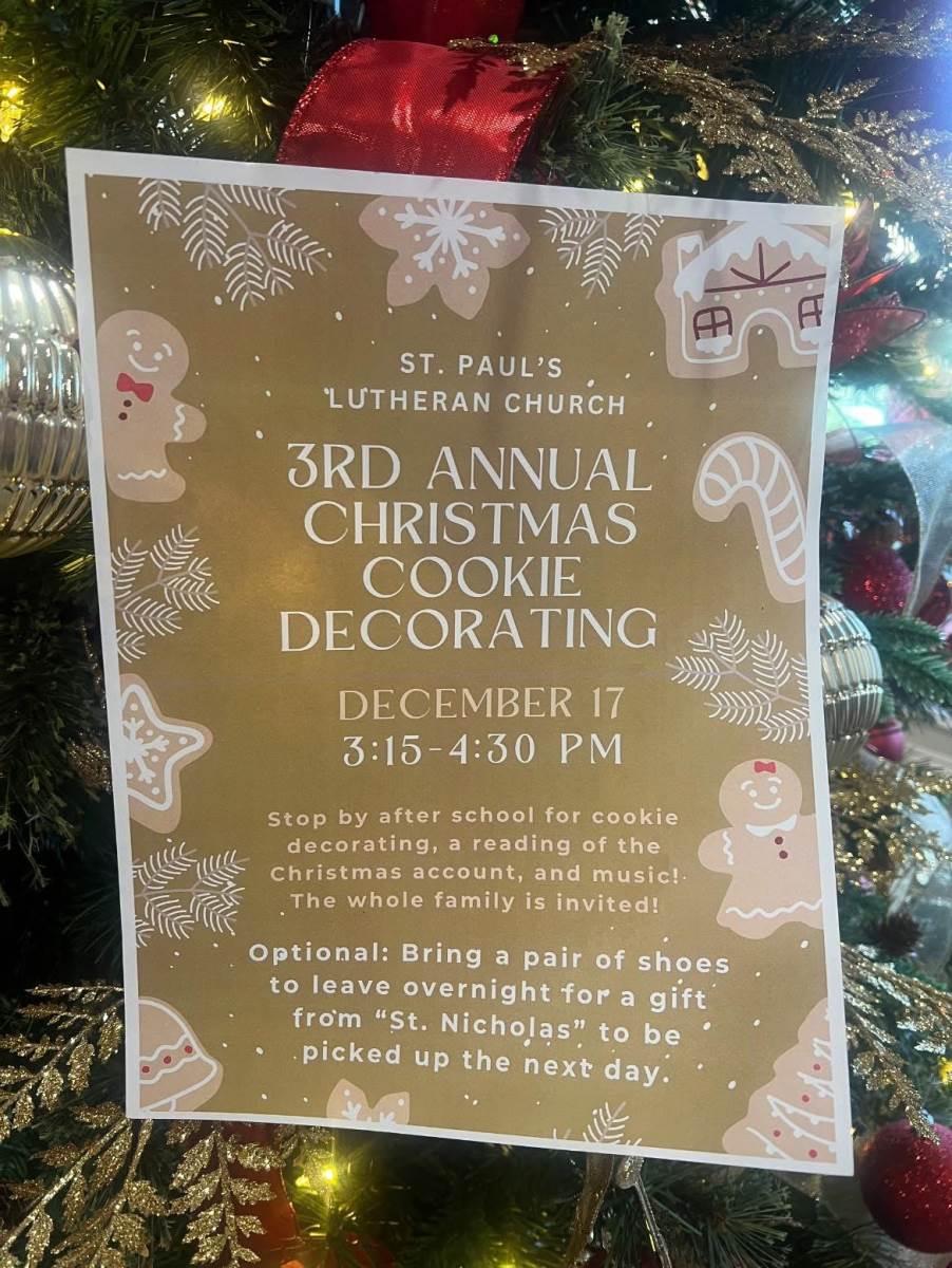St. Paul's Lutheran Church is sponsoring a Christmas Cookie decorating afternoon. Come and decorate some cookies, and then take them home with you!