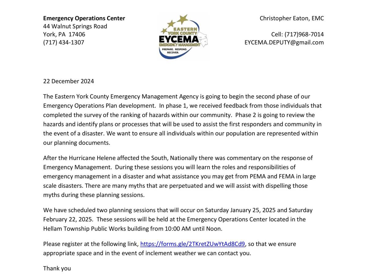 The Eastern York County Emergency Management Agency is going to begin the second phase of our Emergency Operations Plan development. In phase 1, we received feedback from those individuals that completed the survey of the ranking of hazards within our community. Phase 2 is going to review the hazards and identify plans or processes that will be used to assist the first responders and community in the event of a disaster. We want to ensure all individuals within our population are represented within our planning documents.